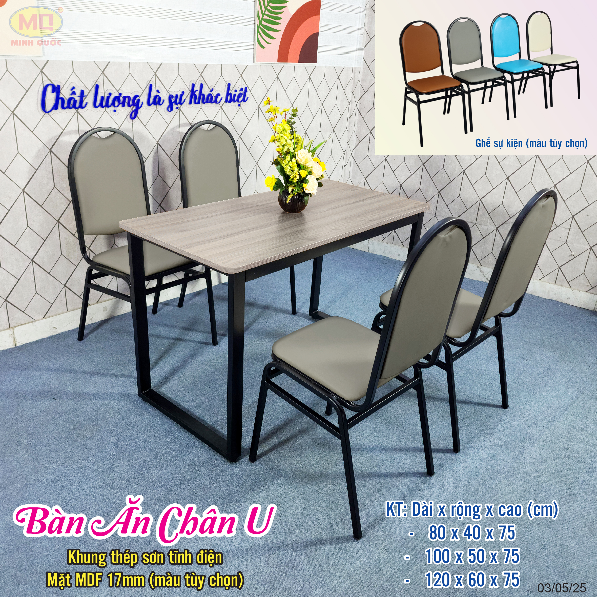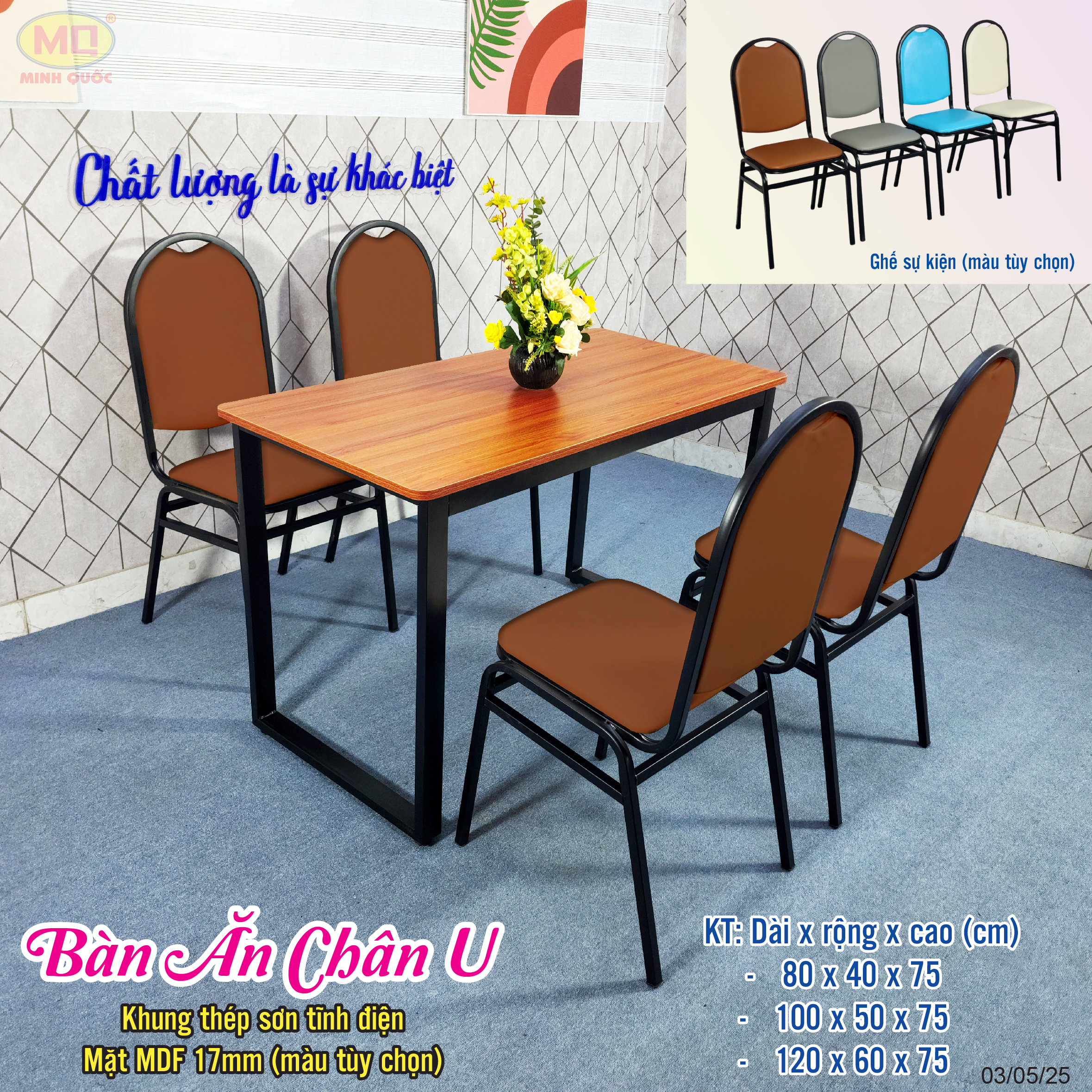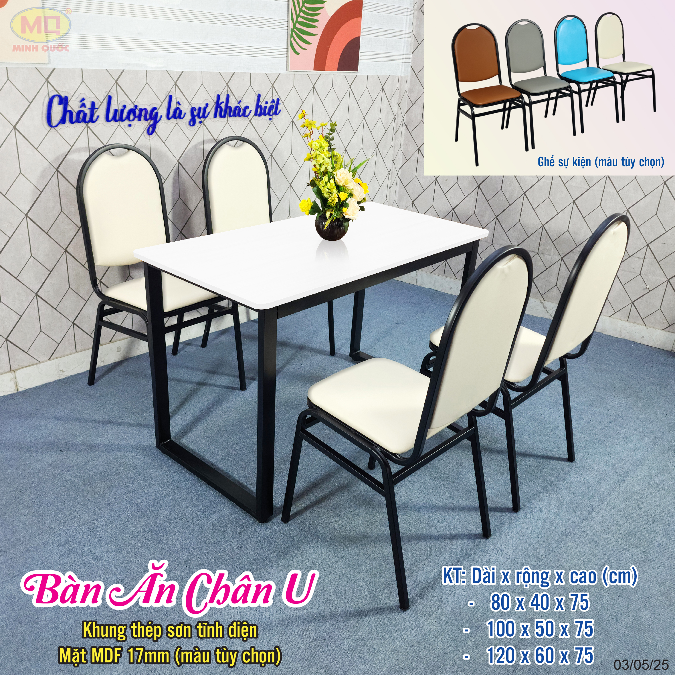 Bàn ăn chân U mặt MDF ghế sự kiện 50×100, 60×120