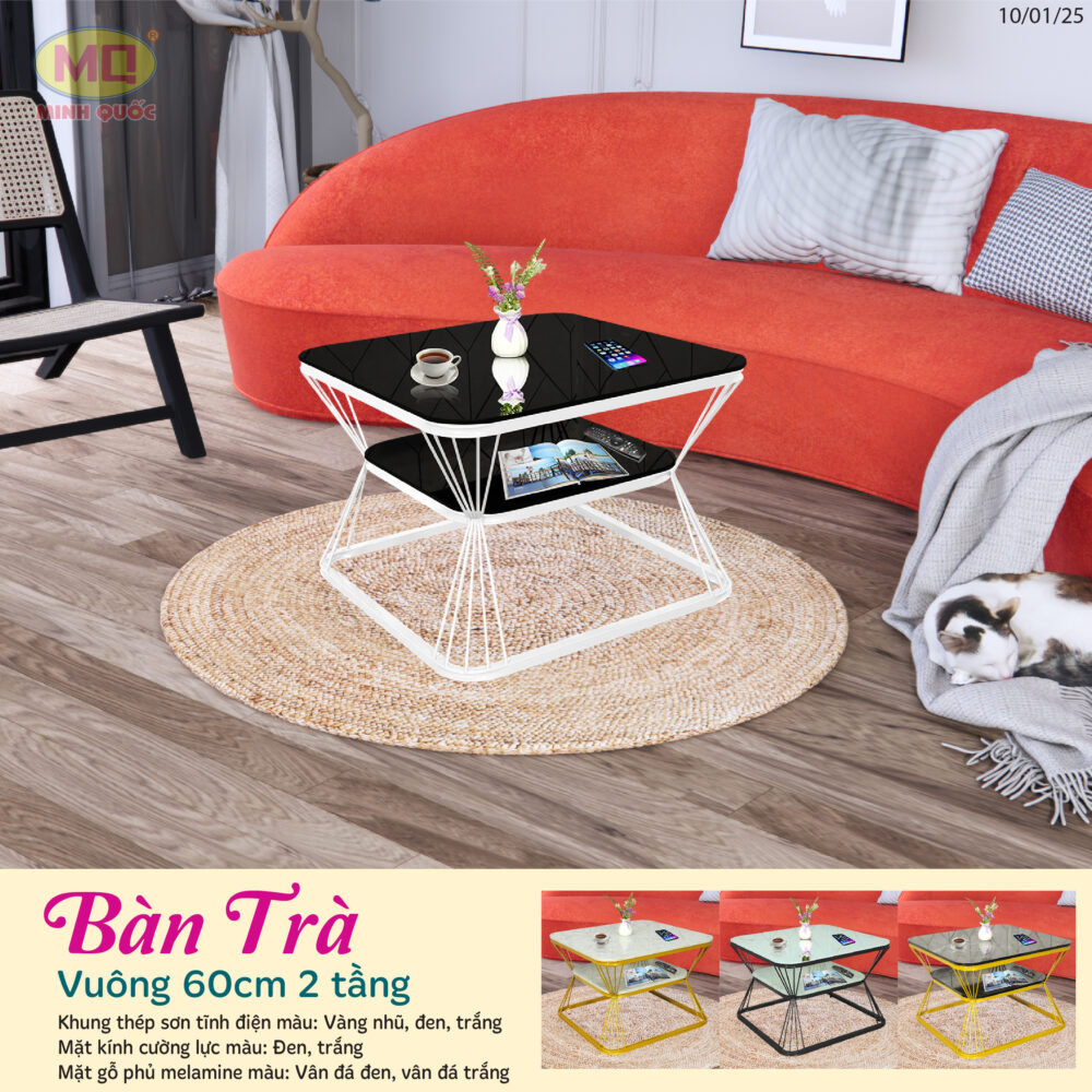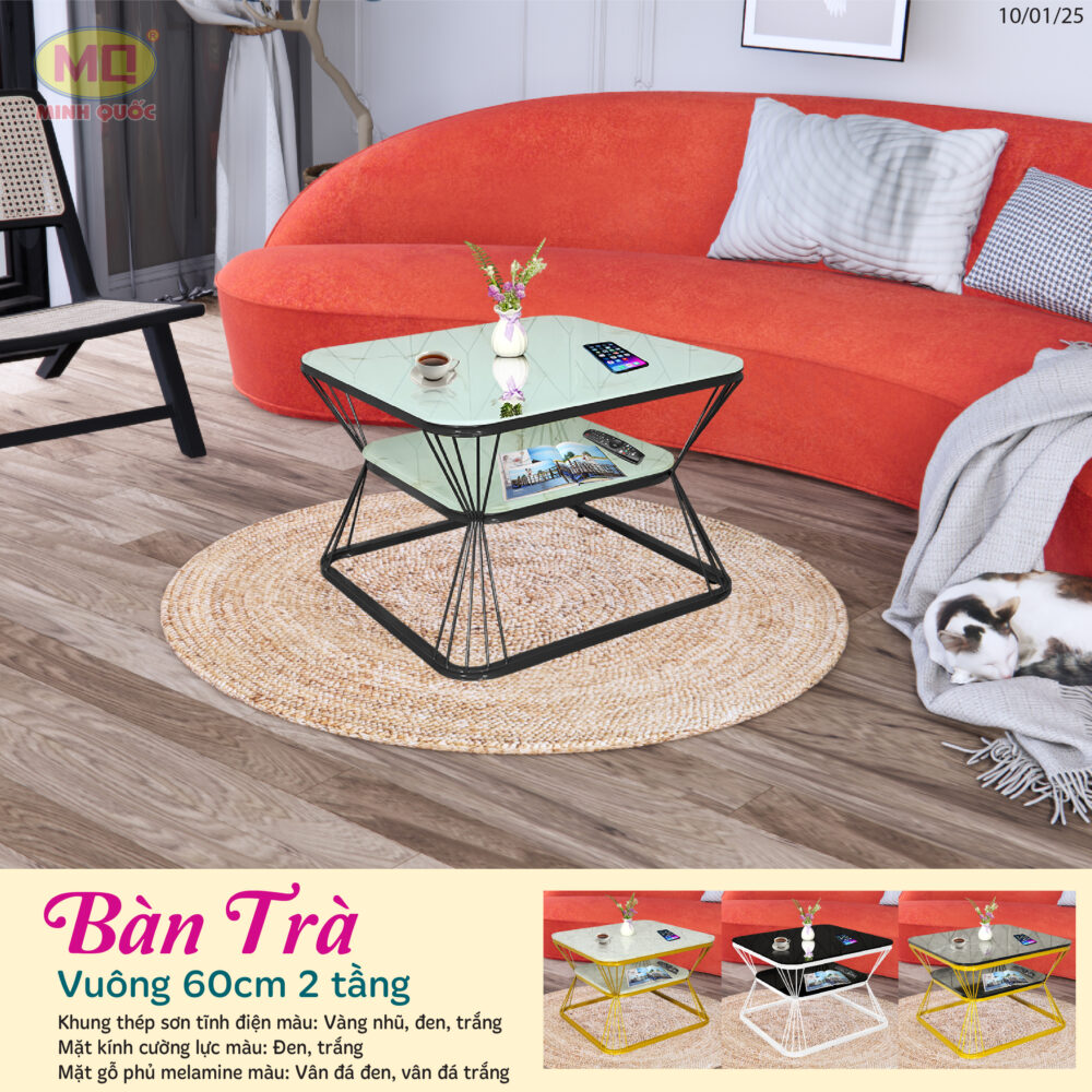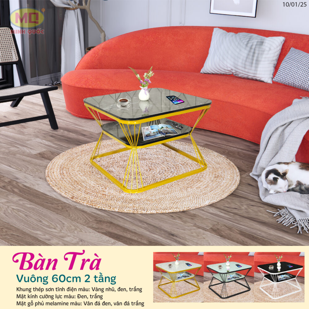 Bàn trà hiện đại kích thước 60x60cm là sự lựa chọn hoàn hảo cho không gian sống của bạn. Với khung thép sơn tĩnh điện chắc chắn, bàn có màu chân thanh lịch gồm vàng nhũ, trắng, và đen tạo điểm nhấn tinh tế cho phòng khách.